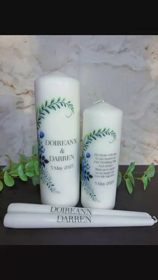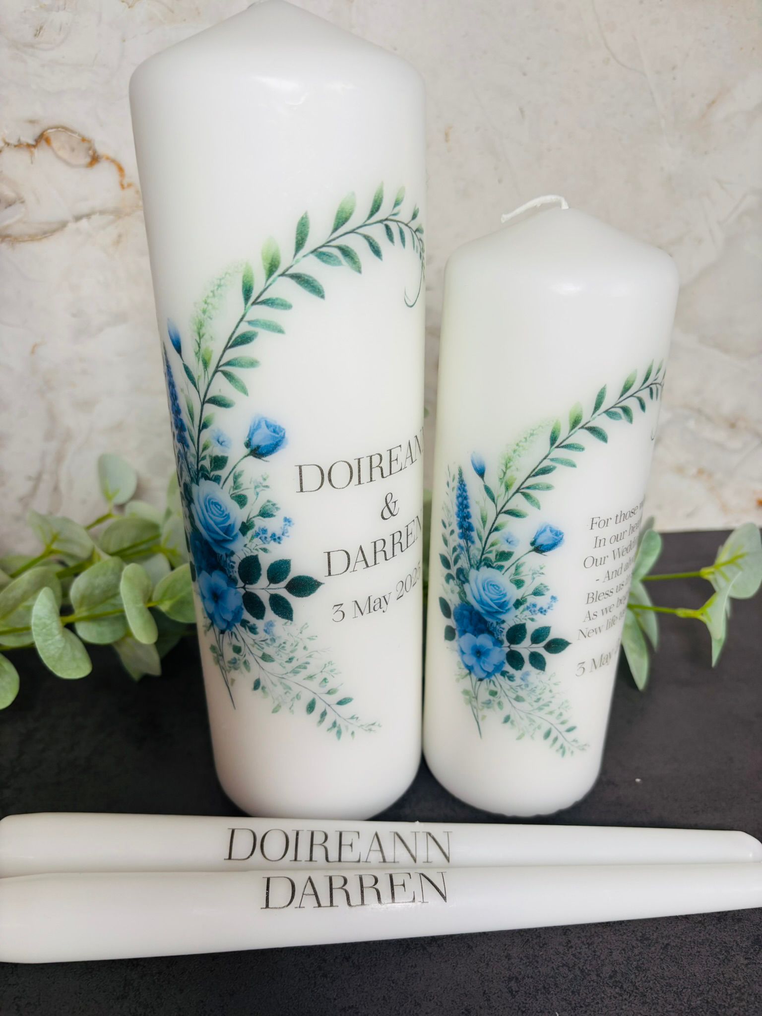 Introducing our Blue Hydrangea Timeless Script Wedding Unity Candles, beautifully crafted for your special day.