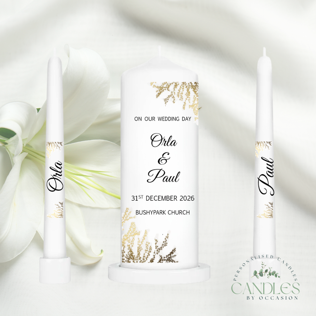 Our Gold Leaf Wedding Unity Candles are beautifully hand-finished and hand-decorated, ensuring the highest quality. Can incorporate gold or black font.