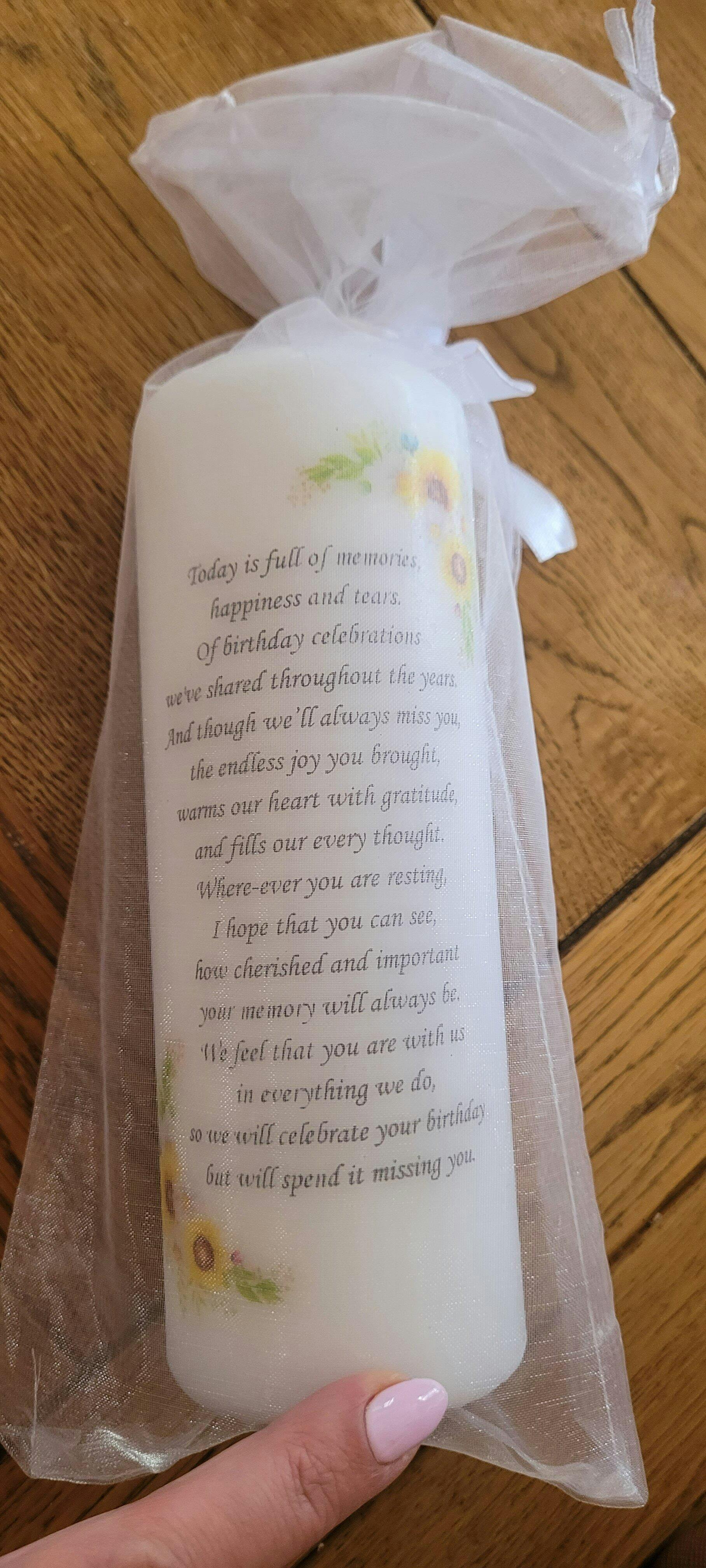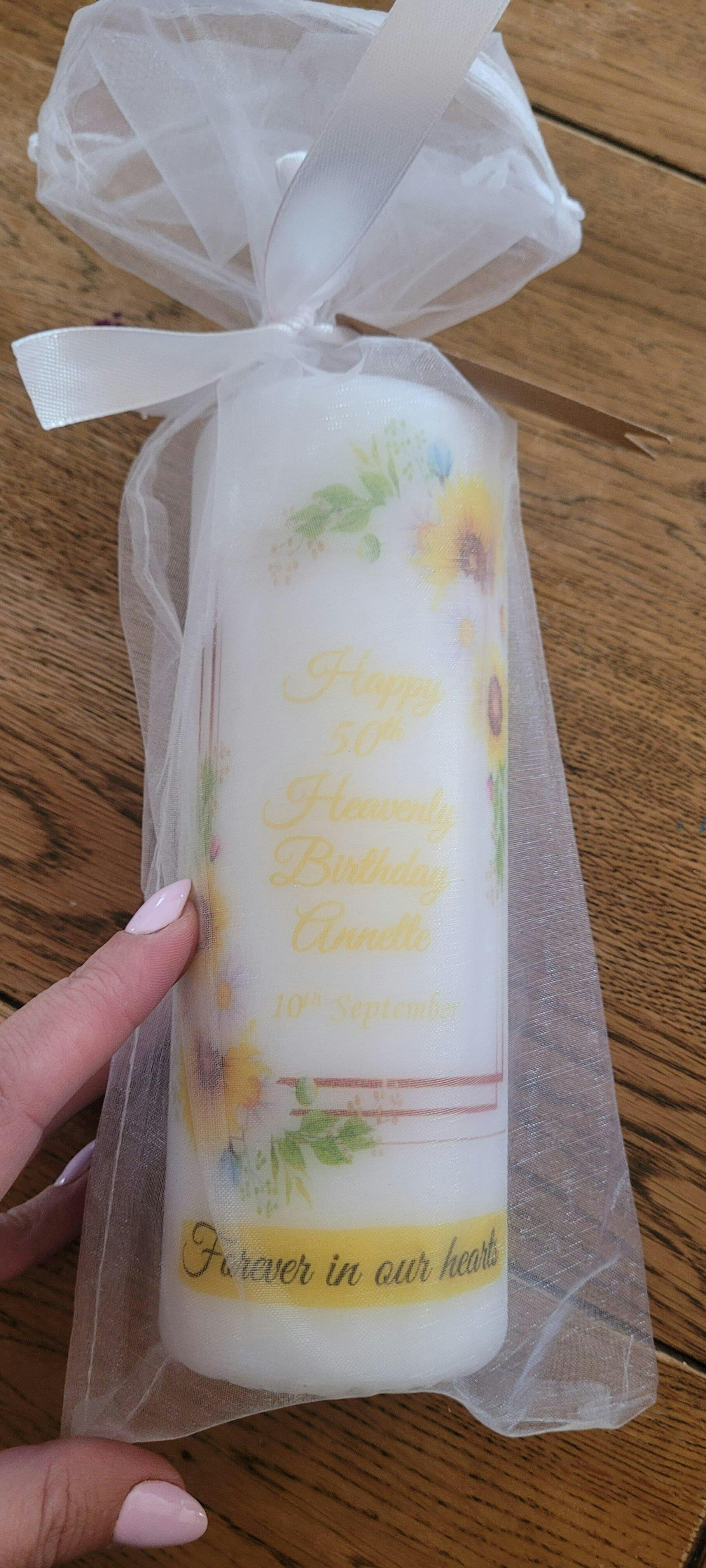 "I ordered memorial candles and have to say they were just lovely. The photograph I sent came out beautifully on the candle along with the wording and design. Quick to reply to emails. Very quick to deliver and well packaged and presented. Cannot thank you enough and would highly recommend your company to others."